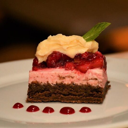 Mousse de frutos rojos bañada en chocolate blanco sobre marquise de chocolate semi amargo y frutos secos. Café & té para acompañar el cierre de la noche.