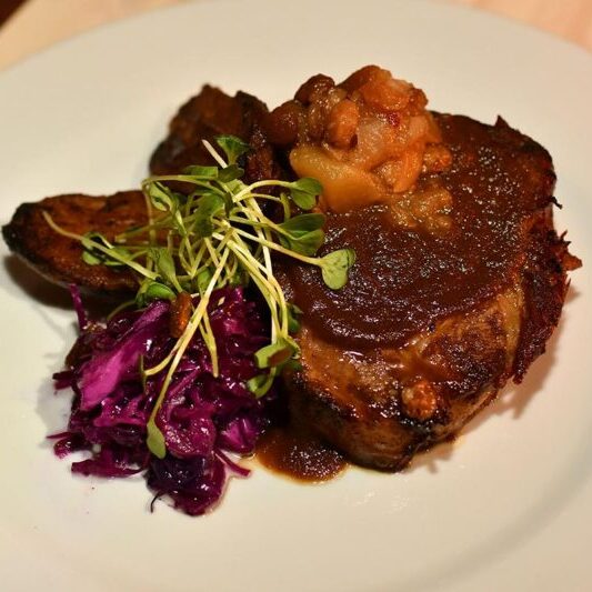 OPC2: Bondiola de cerdo con barbacoa de mosqueta, batatas asadas, chutney de manzanas y peras y col lombarda.
